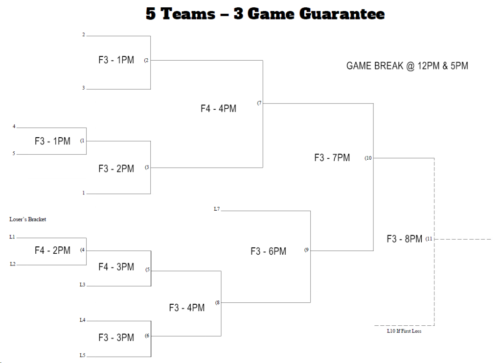 We will complete both our Men's and Women's tournaments entirely on Saturday, with pool play finishing in the morning before we run a double elimination bracket until the conclusion of the event. All teams will have a 5 game guarantee and prizes will include championship rings, swag, jerseys, bats, and more!